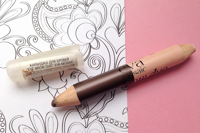 Эта несуразица из мира бровей лежит у меня уже давно с идеей "про запас". Во-первых, мне пришлось искать специальную толстую точилку. У карандаша плохое дерево, которое крошится при любой попытке заточки. Коричневый оттенок с блестками. Явными, большими блестками! Зачем? На бровях это смотрится ...странно. Карандаш слишком твердый, царапает кожу, плохо отдает продукт, приходится возится. Розовый карандаш, по задумке производителя, нужно наносить под бровь и над бровью. Он мягче, чем коричневый, но довольно тяжело тушуется. Продукту максимум 3 балла за идею.