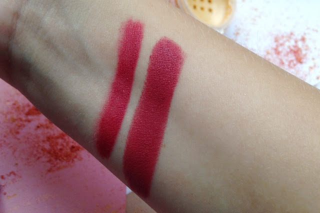 Честно скажу, фото делала в то время, когда уже темнело (потому что с работы вовремя надо уходить, а не как я), поэтому вытягивала цвета. И в жизни оттенок выглядит ВООБЩЕ не так. Хотя он и на разных людях смотрится абсолютно по-разному. Мне кажется, что карандаш чуть-чуть поярче, чем помада.