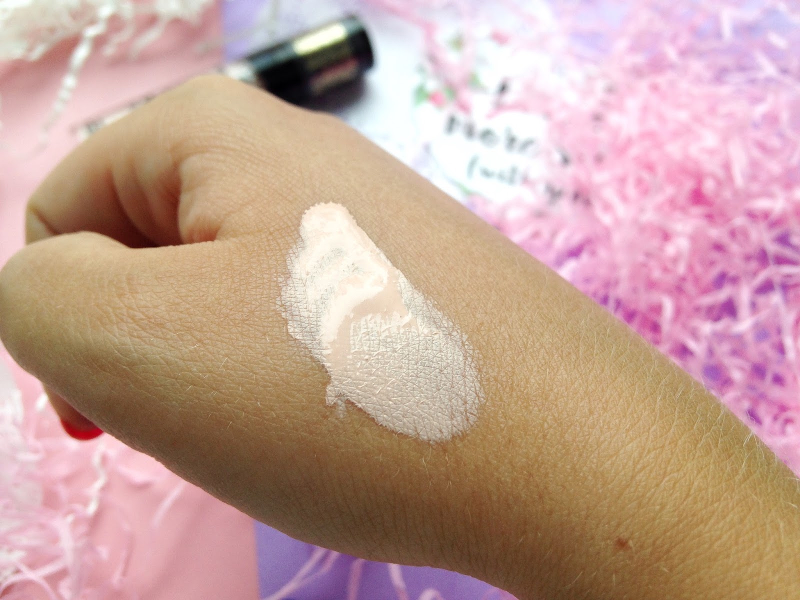 Текстура у базы кремовая, не силиконистая, не тягучая, не восковая, никуда не растекается. Консистенция нежирная, легкая. Оттенок при нанесении на веки сливается с тоном кожи - не смотрите на мои отпускные руки, веки у меня не такие загорелые:))