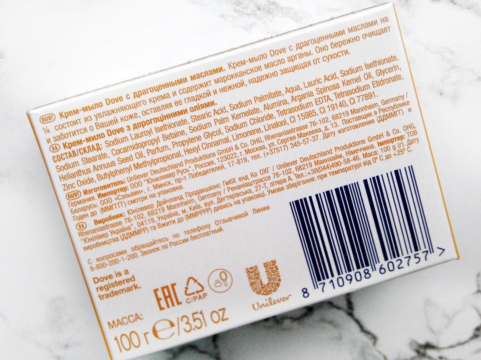 Крем-мыло Dove с драгоценными маслами на ¼ состоит из увлажняющего крема и содержит марокканское масло арганы. Оно бережно очищает и заботится о Вашей коже, оставляя ее гладкой и сияющей, надежно защищая от сухости. Подходит для лица.