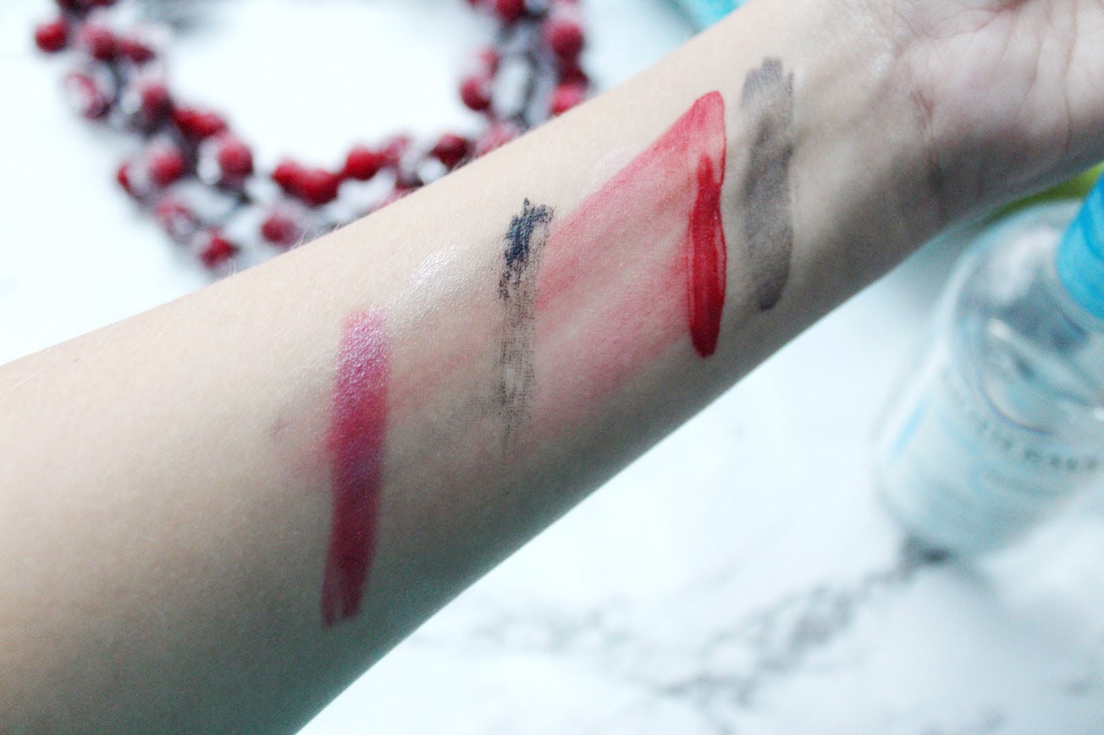 Для наглядности я нанесла на руку: (слева направо) водостойкий карандаш для губ GOSH, хайлайтер Solstice, тушь, камуфляж от CATRICE, стойкую матовую помаду Matte Me и тени в стике GOSH.